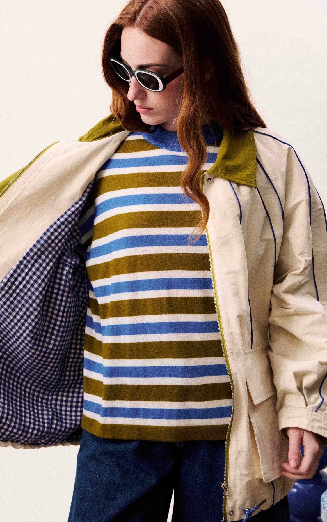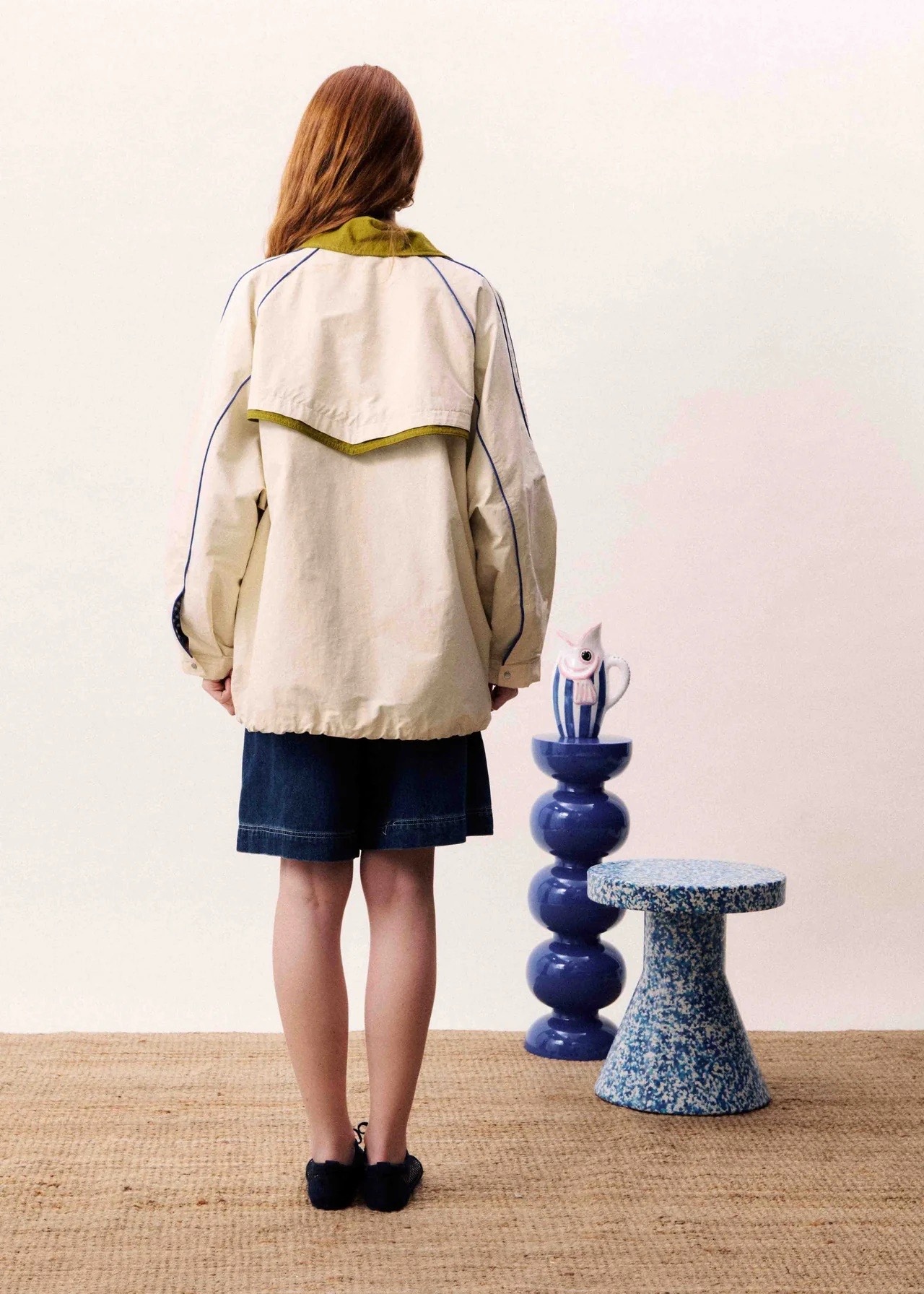 Oversized jacket with contrasting collar and visible stitching details.