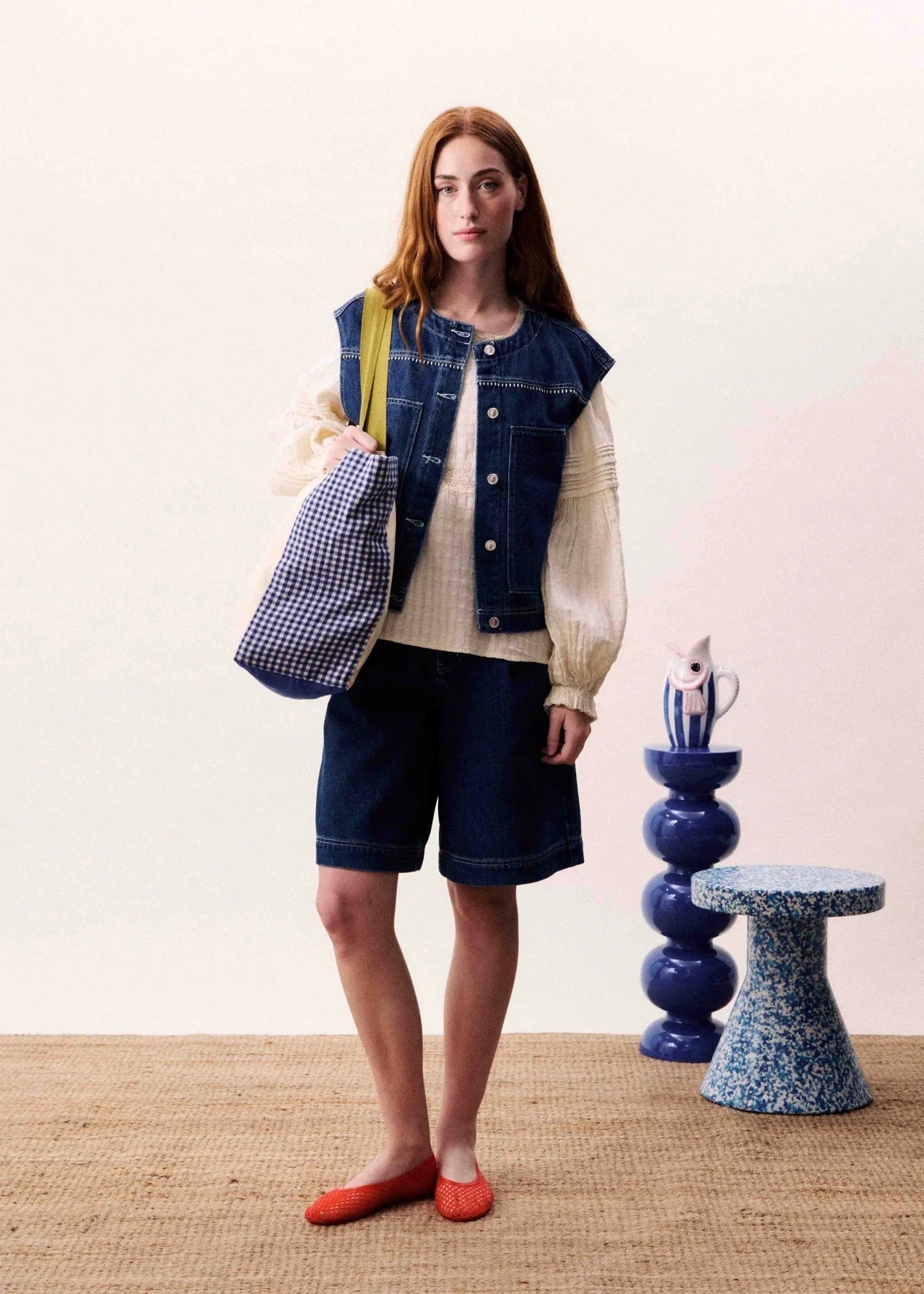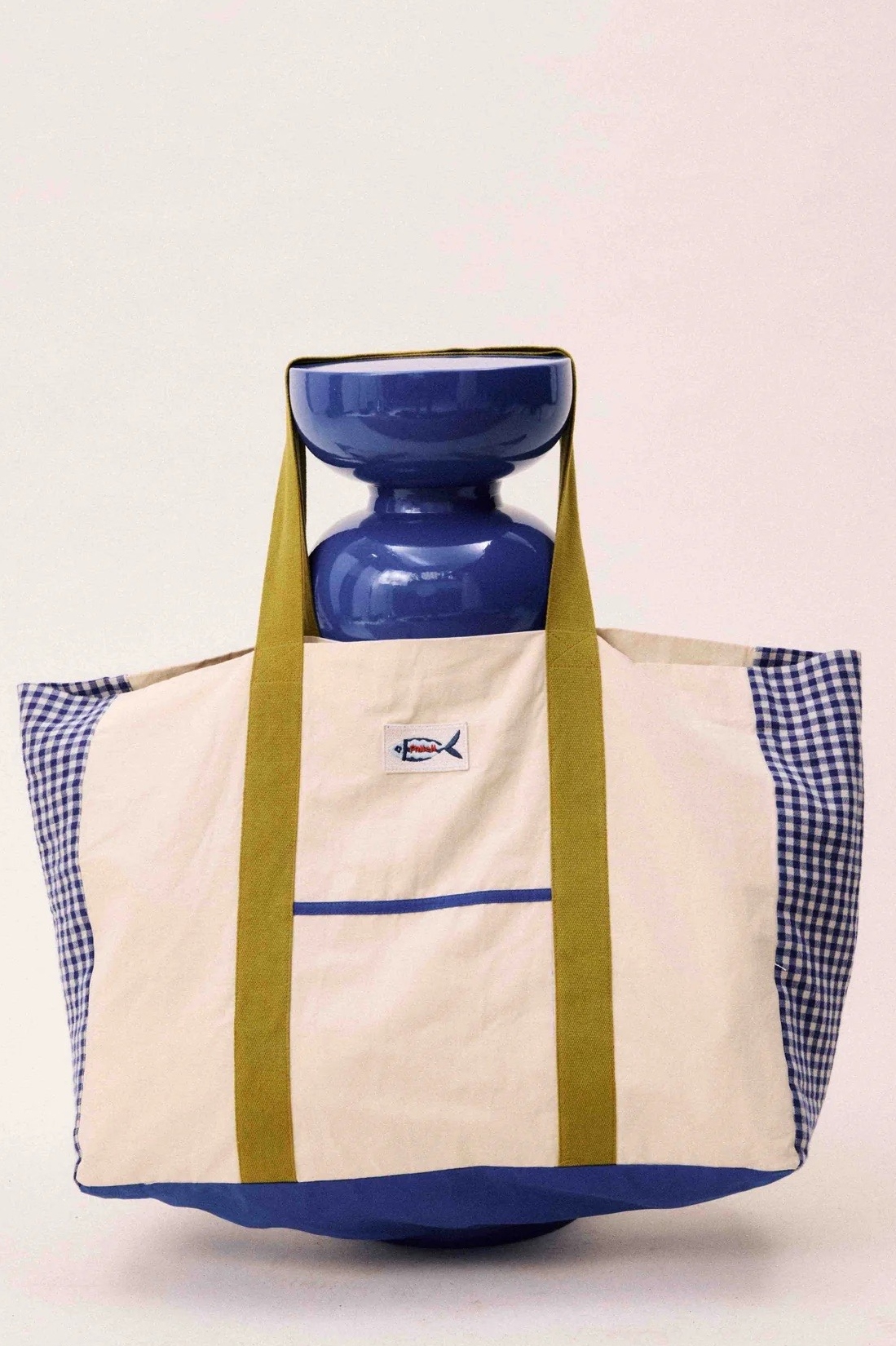 Two tone canvas tote bag with contrasting handles and fish logo.