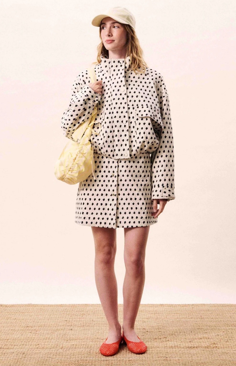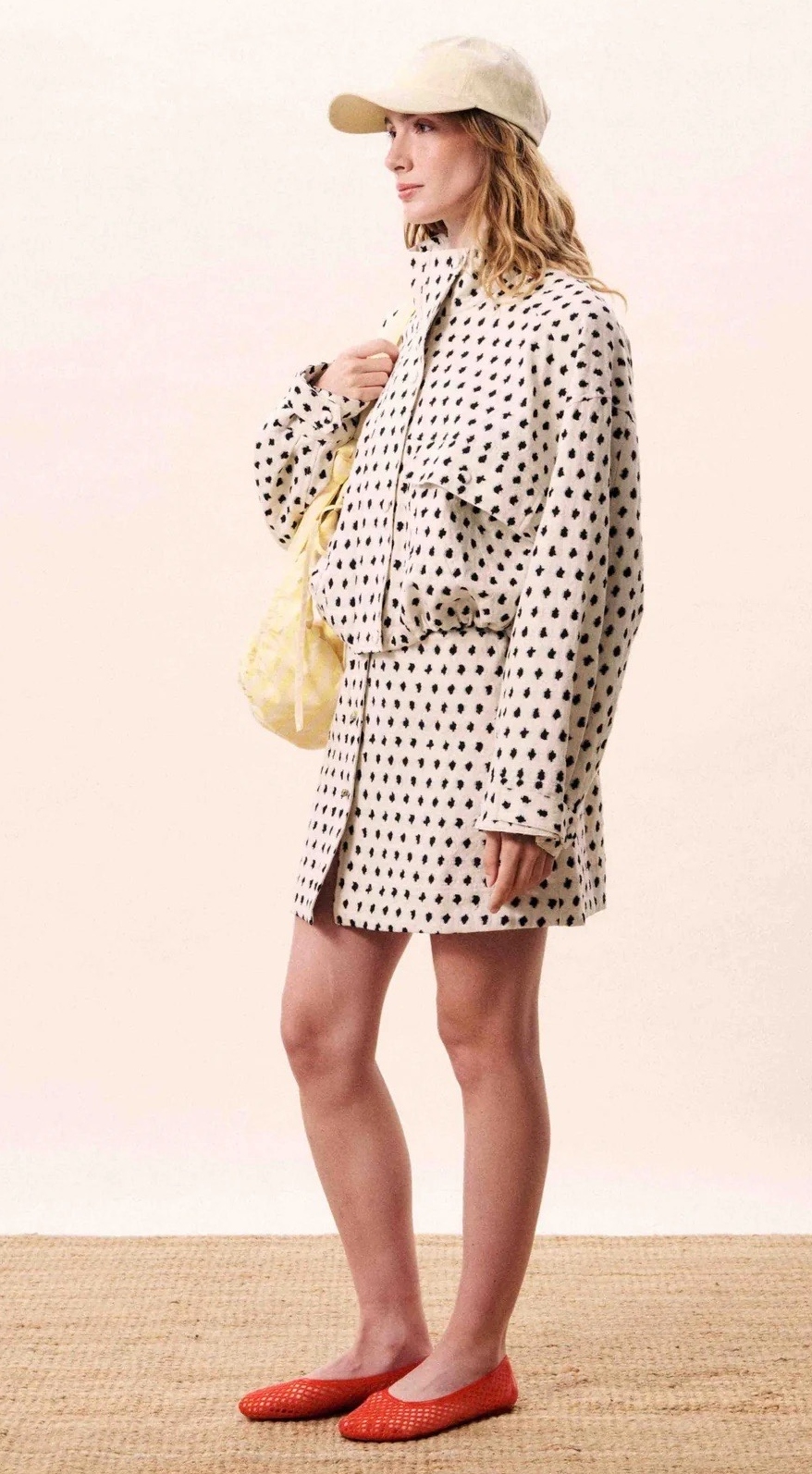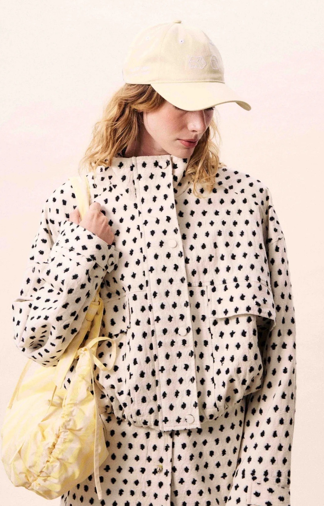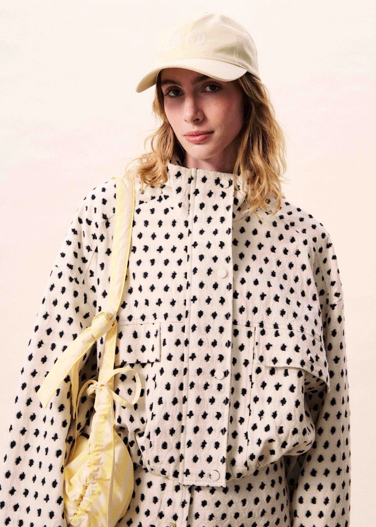 Jacket with polka dot pattern on ecru base.