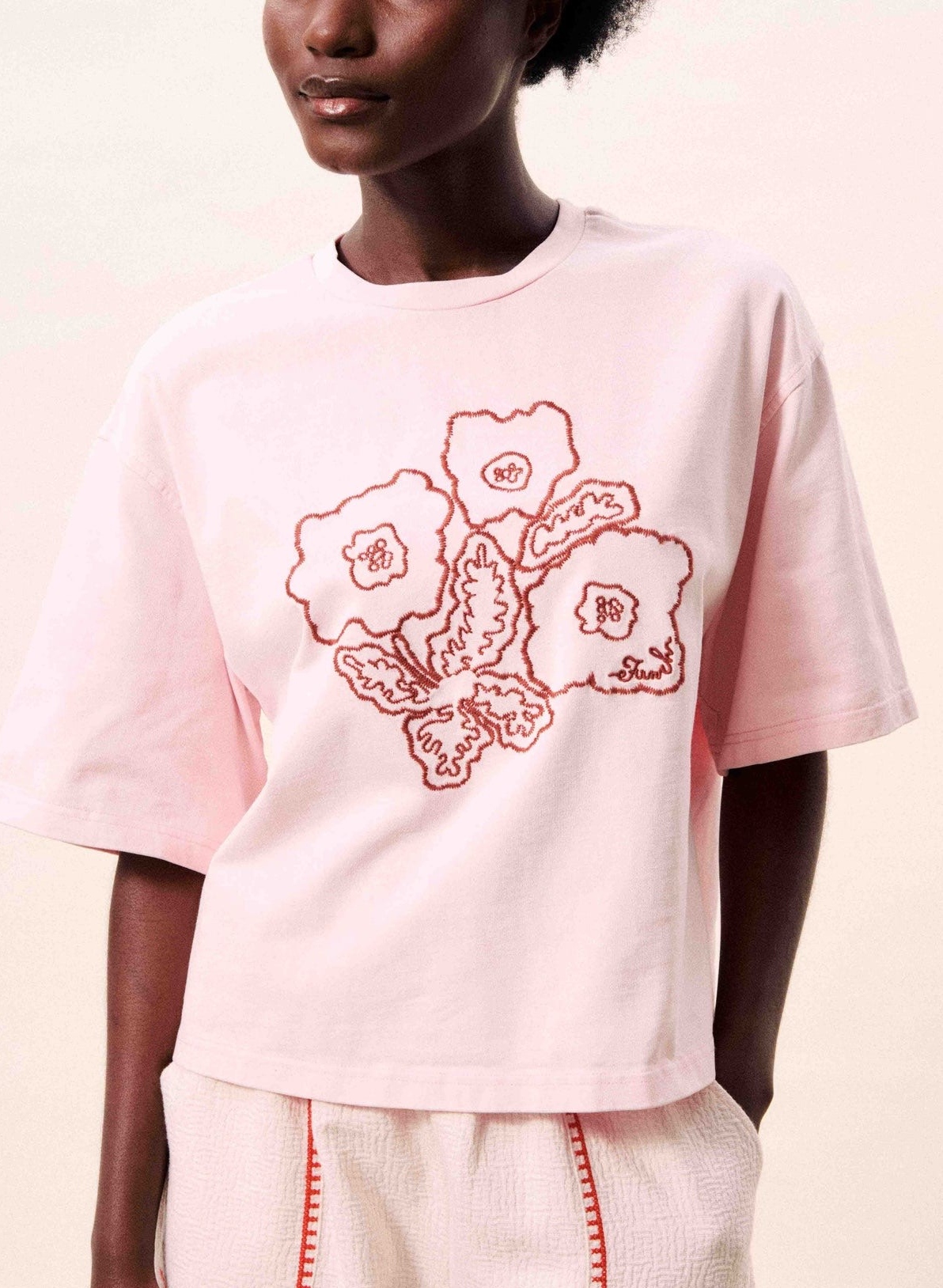 Pink cotton T-shirt with embroidered floral pattern and oversized short sleeves