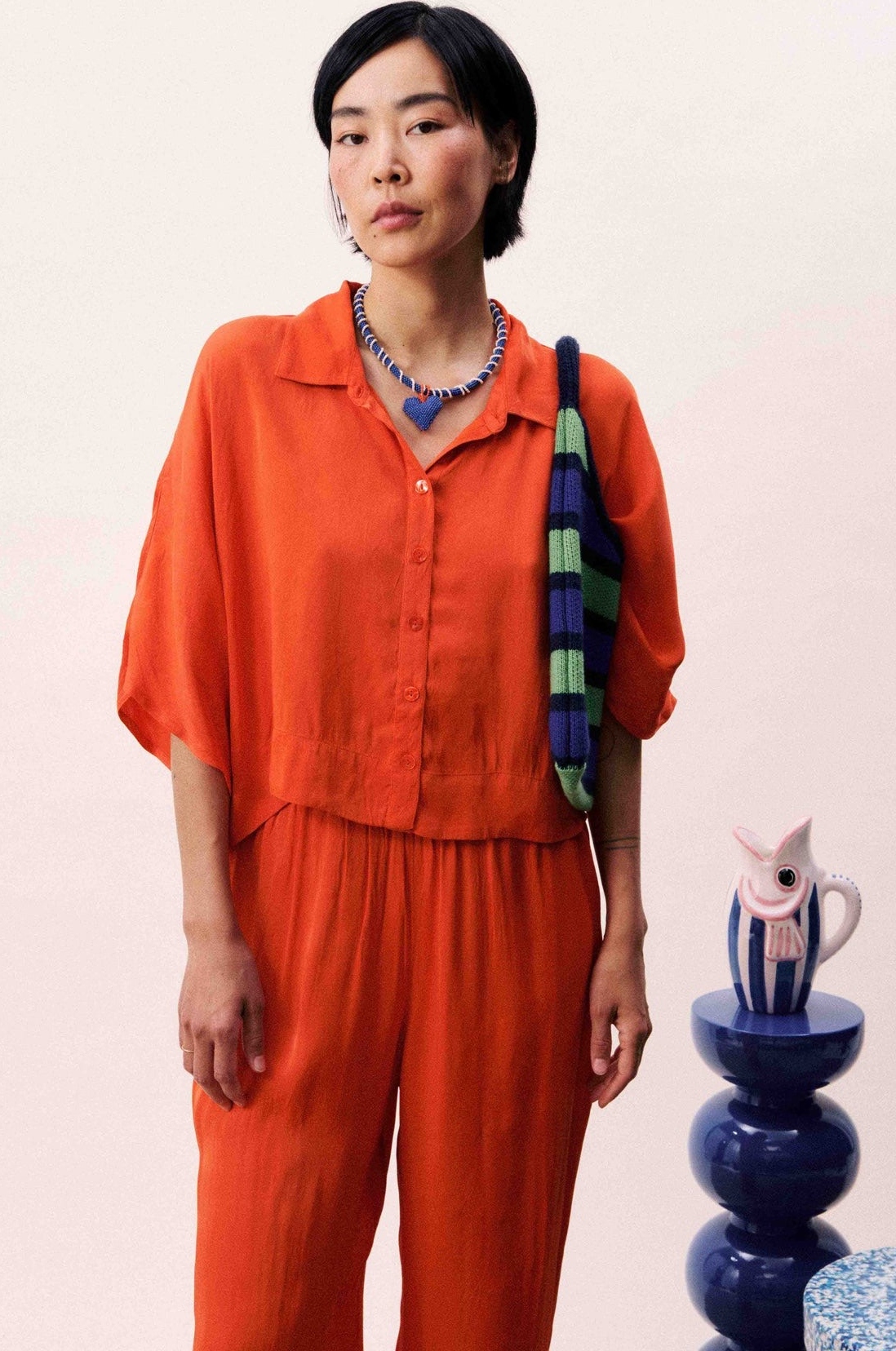Oversize shirt with kimono sleeve and central fastening.