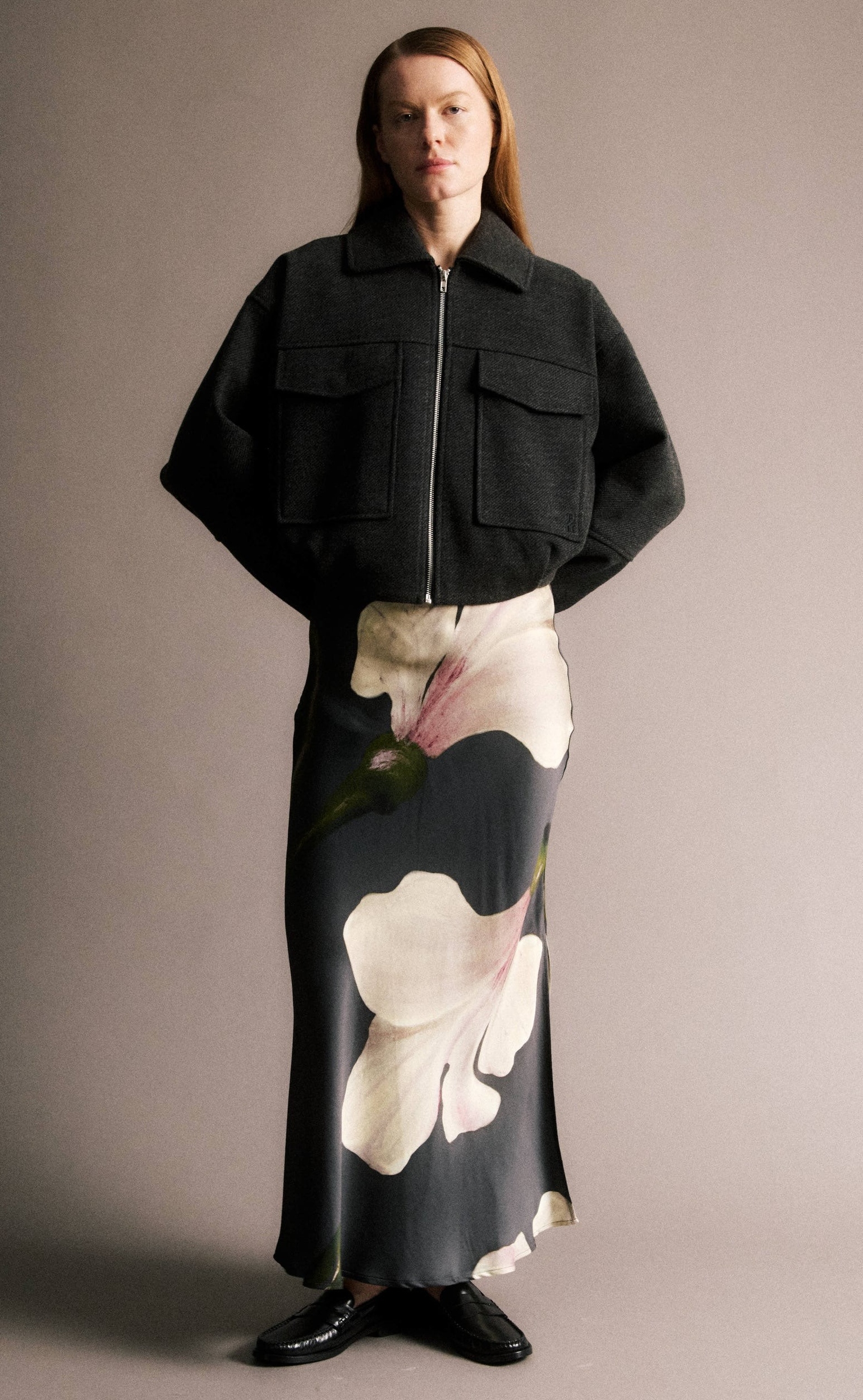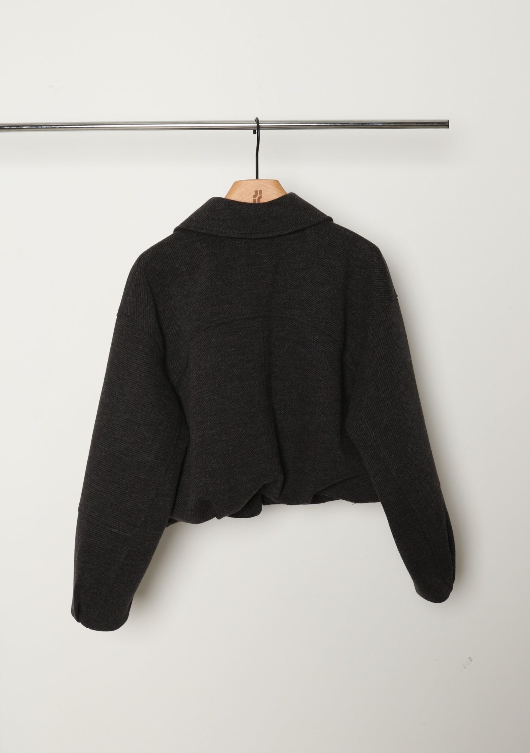 Anthracite grey bomber style jacket, two chest pockets, closed with zip, can be tightened at waist,.