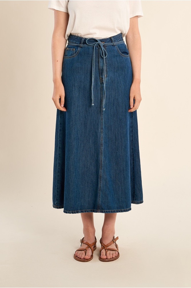 Long denim skirt, knotted at the waist, button and zip closure, patch pockets on the sides and back.