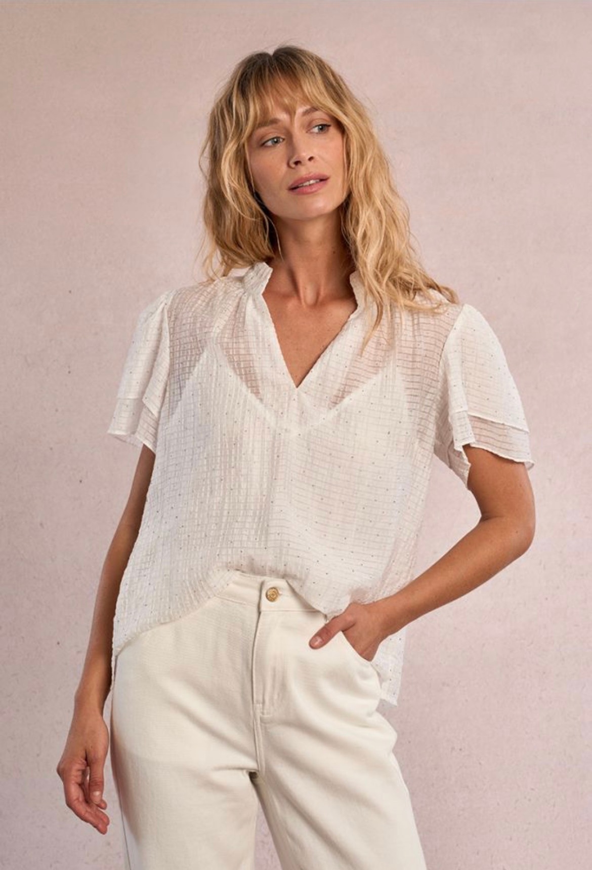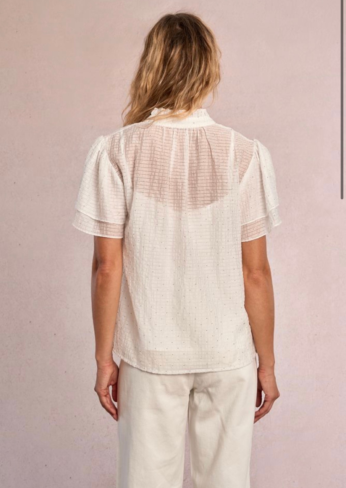 Rhinestone blouse, Short sleeve with ruffles, Straight fit, tunisian collar, 100% polyester.