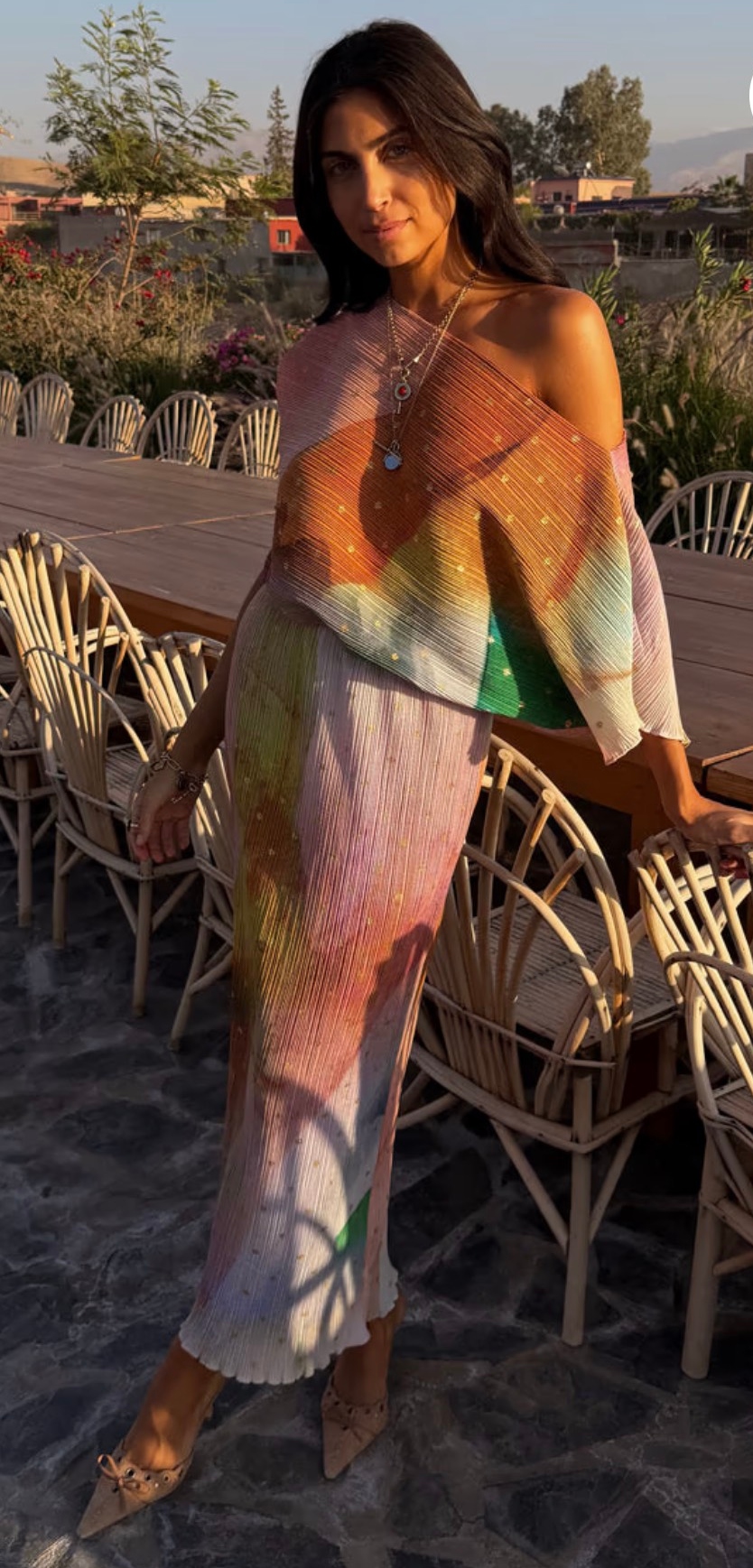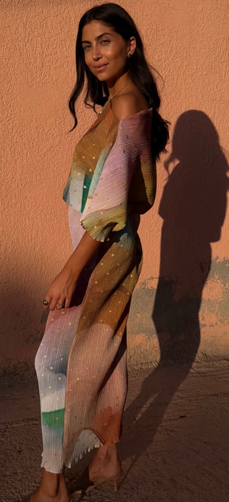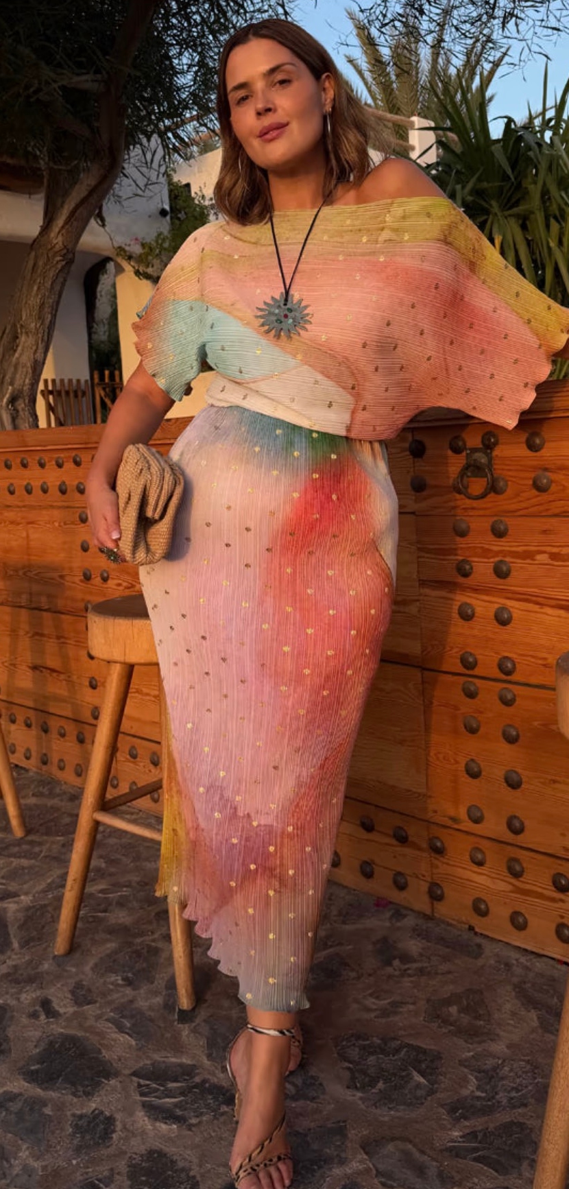 Bestselling metallic fleck print featuring gold brush strokes, that are highlighted by the sunlight on a super chic abstract print. A fitted skirt with a slightly more voluminous top. Perfect for holidays, parties or Summer Wedding.