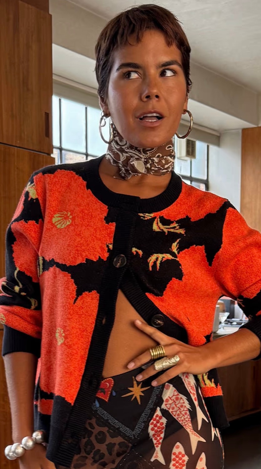The weighty, soft touch knit fabric makes this cardigan feel so luxe and premium! A black base with our iconic, bright and bold poppy print. With wide sleeves for a slightly oversized, boxy look and baby rib cuff and hem detailing, pair this cardi with some leopard jeans or thrown over the matching mesh dress for a classic day to night outfit.