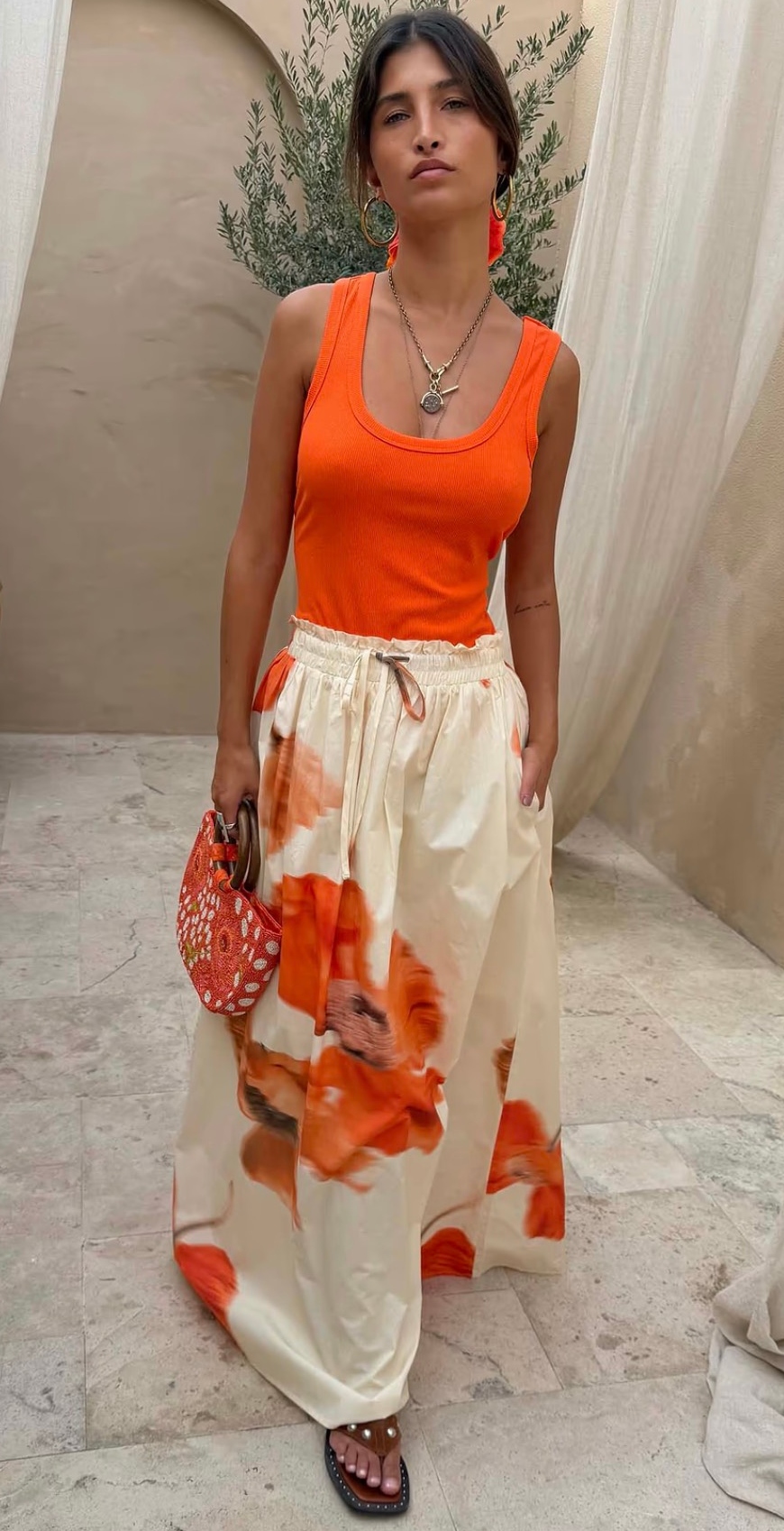 A lightweight, cotton base that keeps you cool through the summer heat, with motifs from our new blurred floral print adding a touch of NFD flare. The a-line silhouette makes this skirt perfect for everybody while the frill detailing along the waistband adds a touch of femininity and texture to the other wise simple silhouette. With a drawstring fastening for extra comfortability, pair with our coral scoop tank for an elevated day to night look.