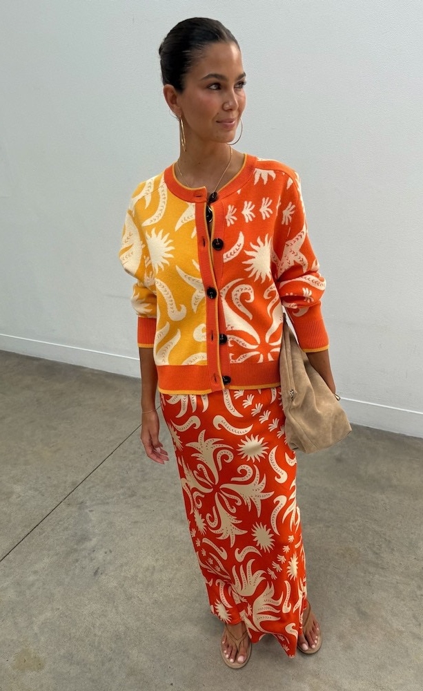 A beautiful mix of Orange and lemon in the soft touch knit base Cardigan. A slight fitted silhouette with ribbed cuffs and neckline for structure.