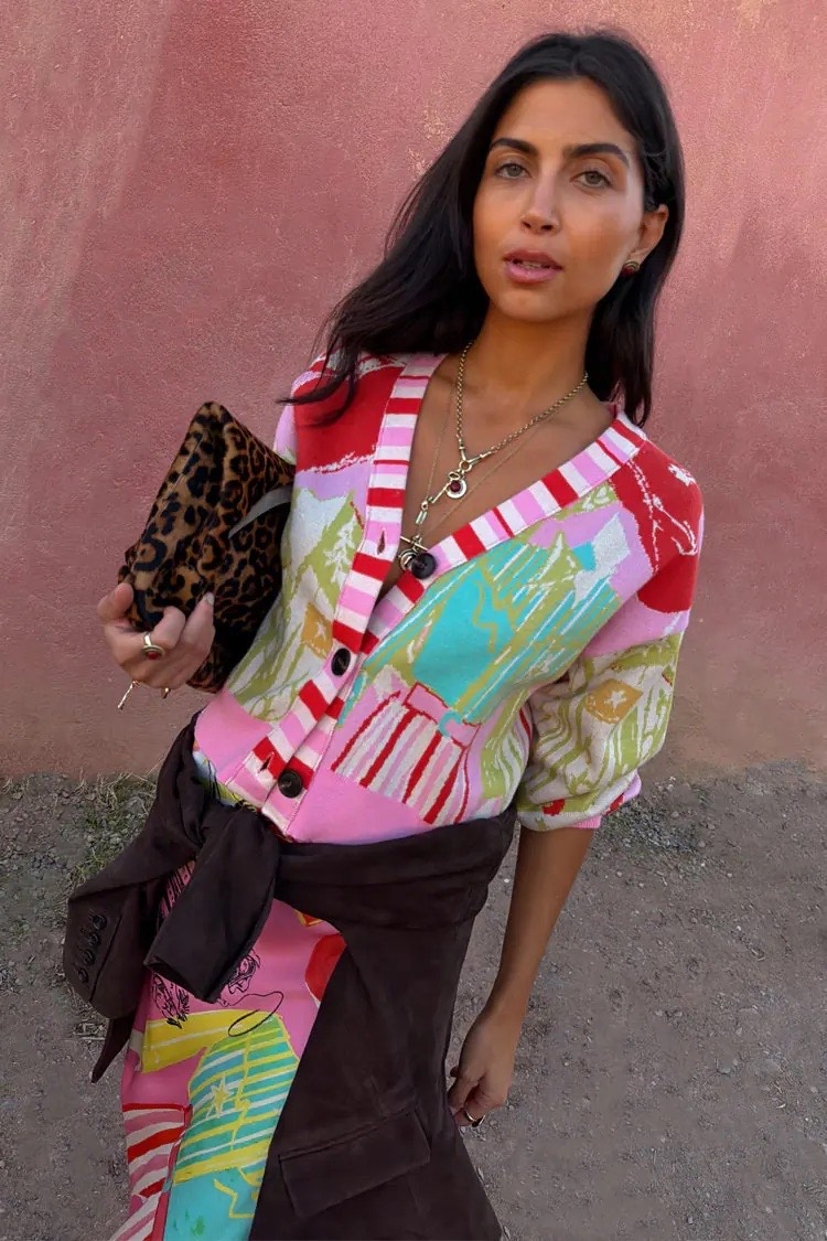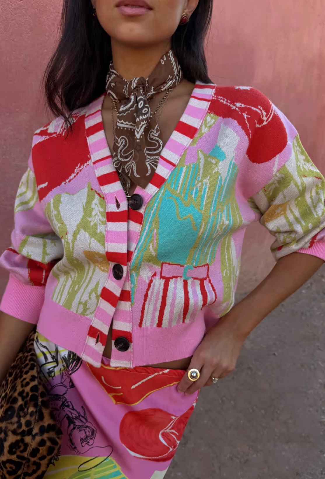 Our bestselling knits are weighty, soft touch and a definite wardrobe staple! Our new dallas print range features abstract cowboy silhouettes and cowgirl motifs, create in-house by our design team. A bright and bold colourway, with the pink stripe detailing on the button stand adding an extra touch of NFD flare. Pair with the matching dorris skirt for the perfect feel good throw on!