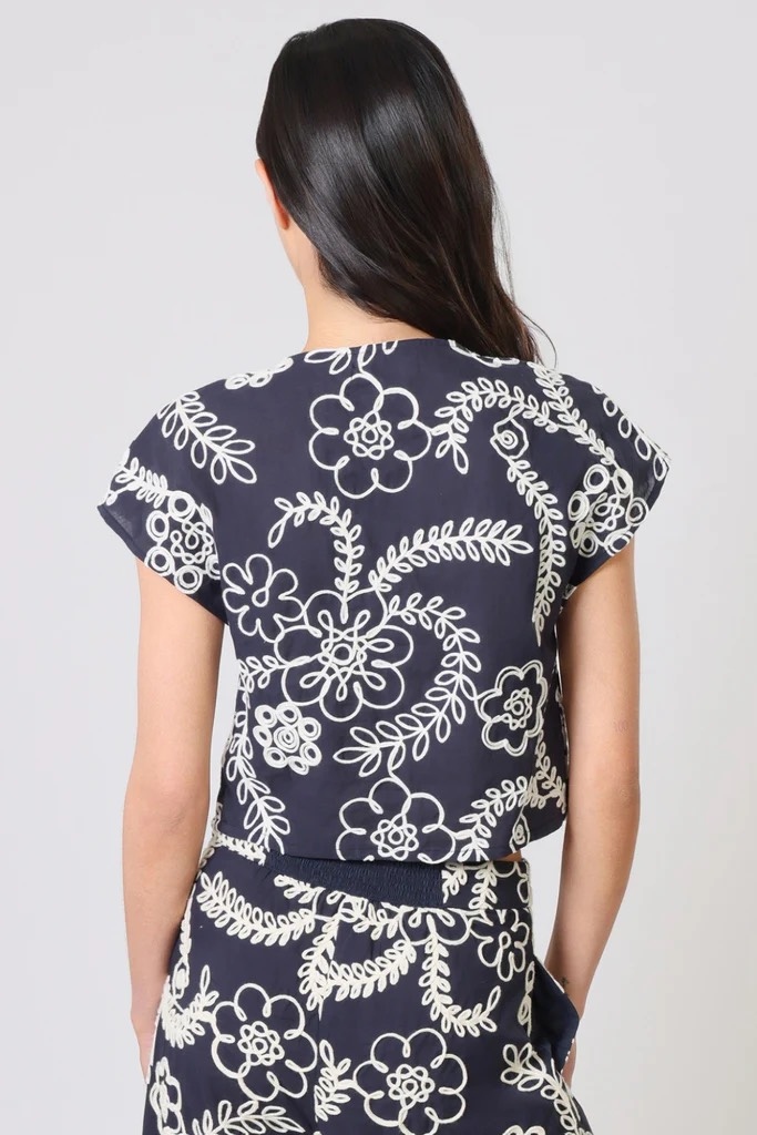 A classic deep v neck fit with a button down front. It's a great versatile piece for layering over any outfit, or wearing on it's own. Bringing the Summer vibes in this navy and white floral embroidered cotton. Just pair with our matching Rene Trouser for a beautiful outfit.