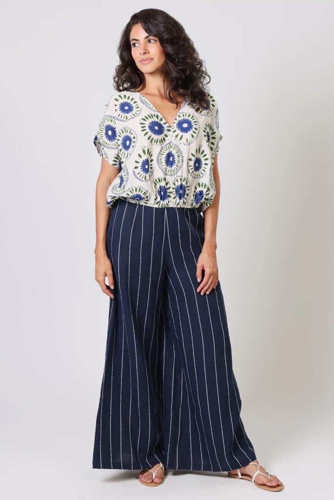 A beautiful loose fit v neck top. The low drop cap short sleeves and elasticated hem create a flattering and chic boho style silhouette. Perfect Summer vibes in this white, blue and green print fabric. Finish the look with matching Rene trousers for a full outfit.