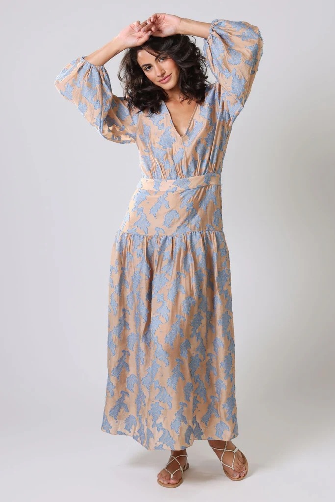 The Symi dress is a gorgeous tiered hem maxi dress, with a loose fit top, voluminous skirt and long billow sleeves with elasticated cuffs.